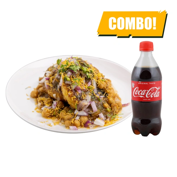 A flavorful street-style combo featuring crispy Aloo Tikki topped with tangy chutneys, curd, and spices, paired with a chilled cold drink for a refreshing finish.