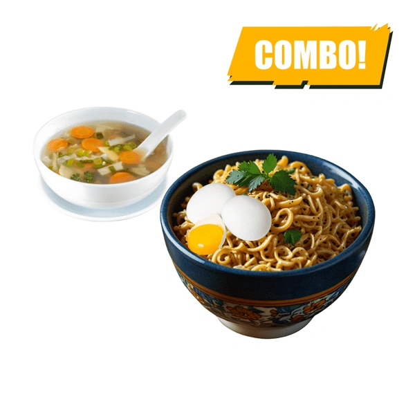 Fluffy scrambled eggs mixed with flavorful Maggi noodles, paired with a warm, savory Soup. A comforting and wholesome combo that’s perfect for any time of the day.
